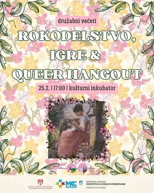 Kulturni inkubator +1 moreROKODELSTVO, IGRE & QUEER HANGOUTSreda, 25. februar 2026 // 17.00 // Kulturni inkubatorPridi na še eno edicijo Queer hangouta! Vidimo se v sredo, 25. februarja 2026, med 17.00 in 20.00 v Kulturnem inkubatorju.Druženje bomo začele_i s šivanjem in vezenjem. Materiale zagotovimo me_i, prav tako mentorsko podporo, tako da predznanje ni potrebno. Na druženju bosta na voljo dva aparata za izdelovanje značk v velikosti 25 mm in 44 mm. Motiv značke si lahko pripraviš že doma, lahko pa na delavnici. Vsi materiali bodo na voljo brezplačno.Vzporedno z delavnico bo potekalo druženje Kokic in iger, kjer ne bo manjkalo ne ne . Svojo najljubšo igro lahko udeleženci_ke prinesejo tudi s seboj.Na voljo je naš velik nabor iger, imamo jih okoli petdeset. Nekatere med njimi so: Barking Kittens, Exploding kittens, Cards Against Heteronormativity, Pride Playing Cards, 6 vzame!, Catan, Uno, Dixit, A Fake Artist goes to New York …